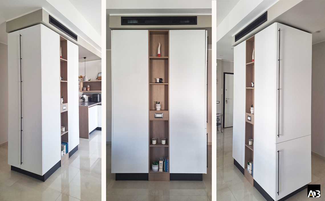 frigorifero, mentre al centro un raffinato sistema di mensole su boiserie cela il pilastro esistente e
